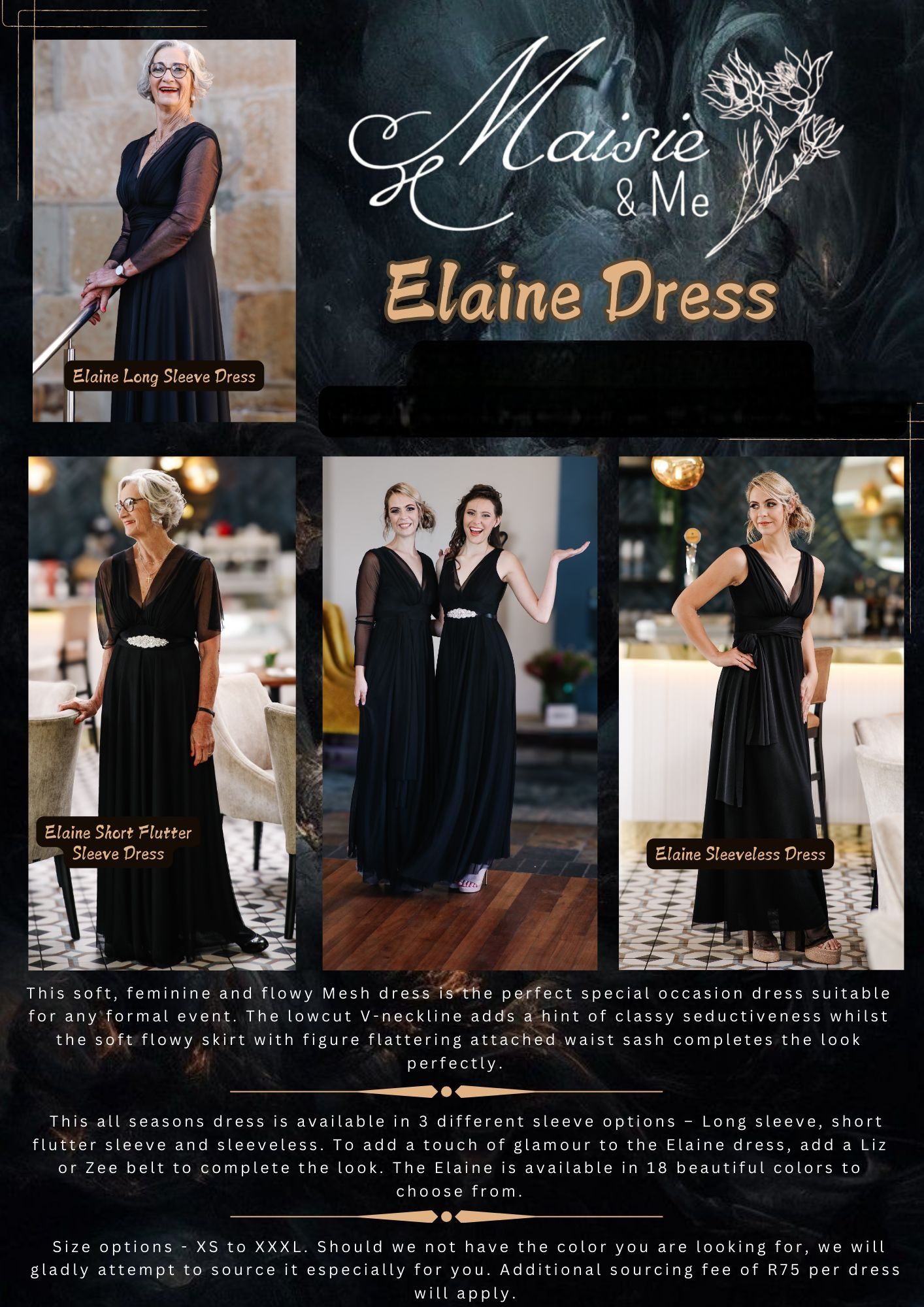 Should we not have the color you are looking for, we will gladly attempt to source it for you. Additional sourcing fee of R75 per dress will apply