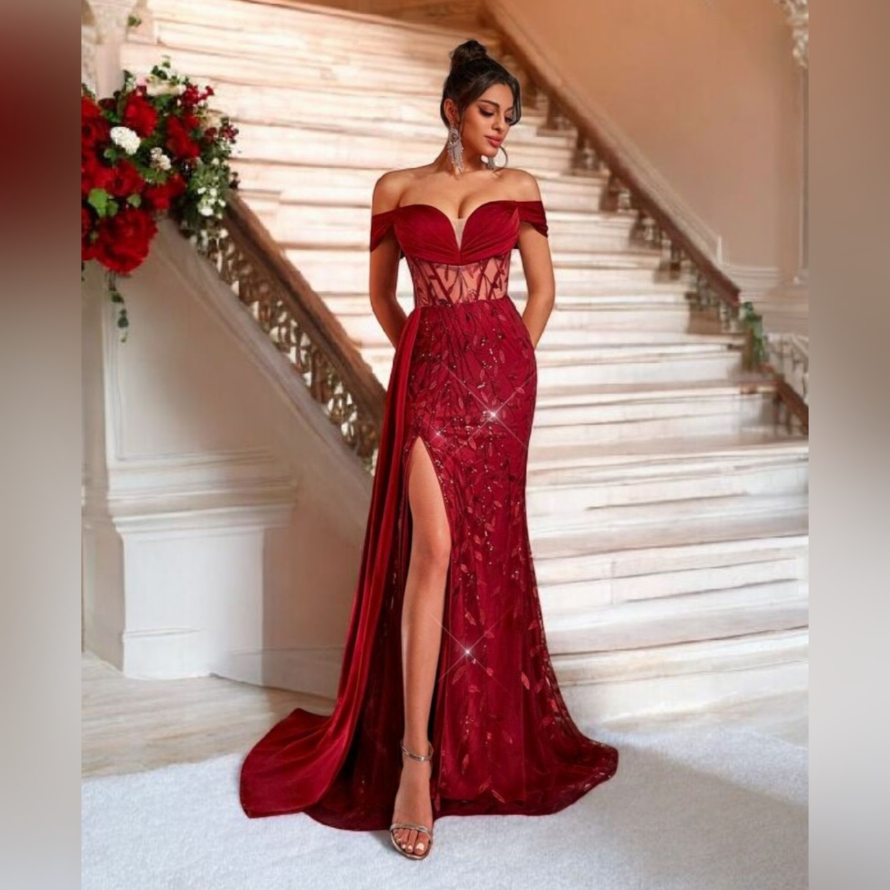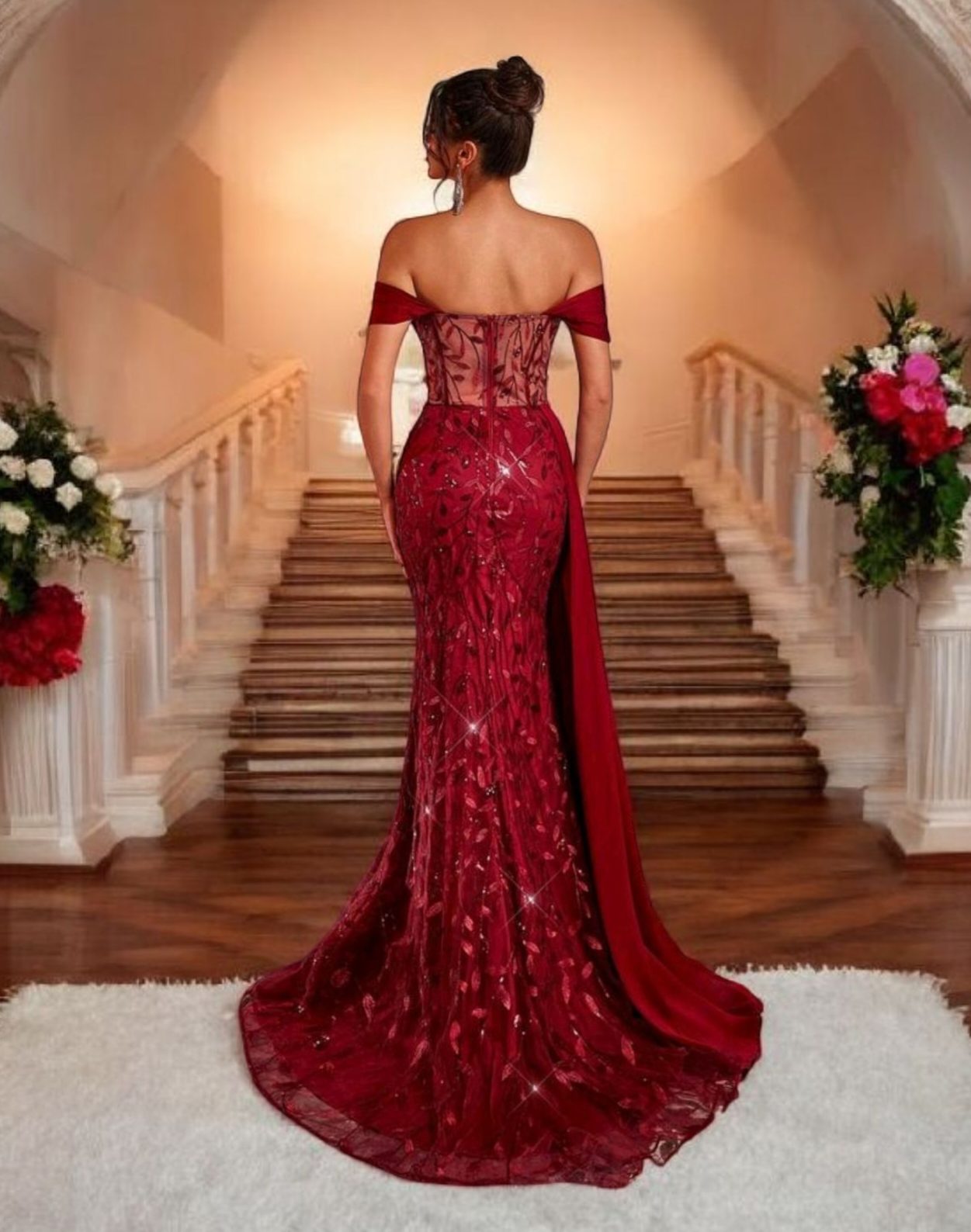 Off Shoulder Embroidered Sequin High Slit Fishtail Dress
