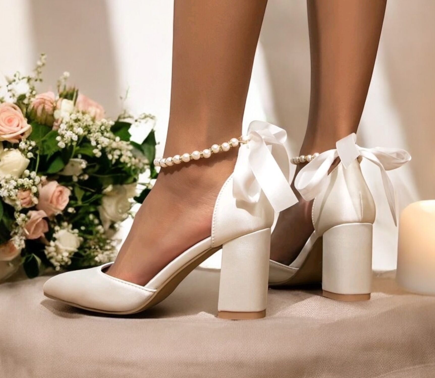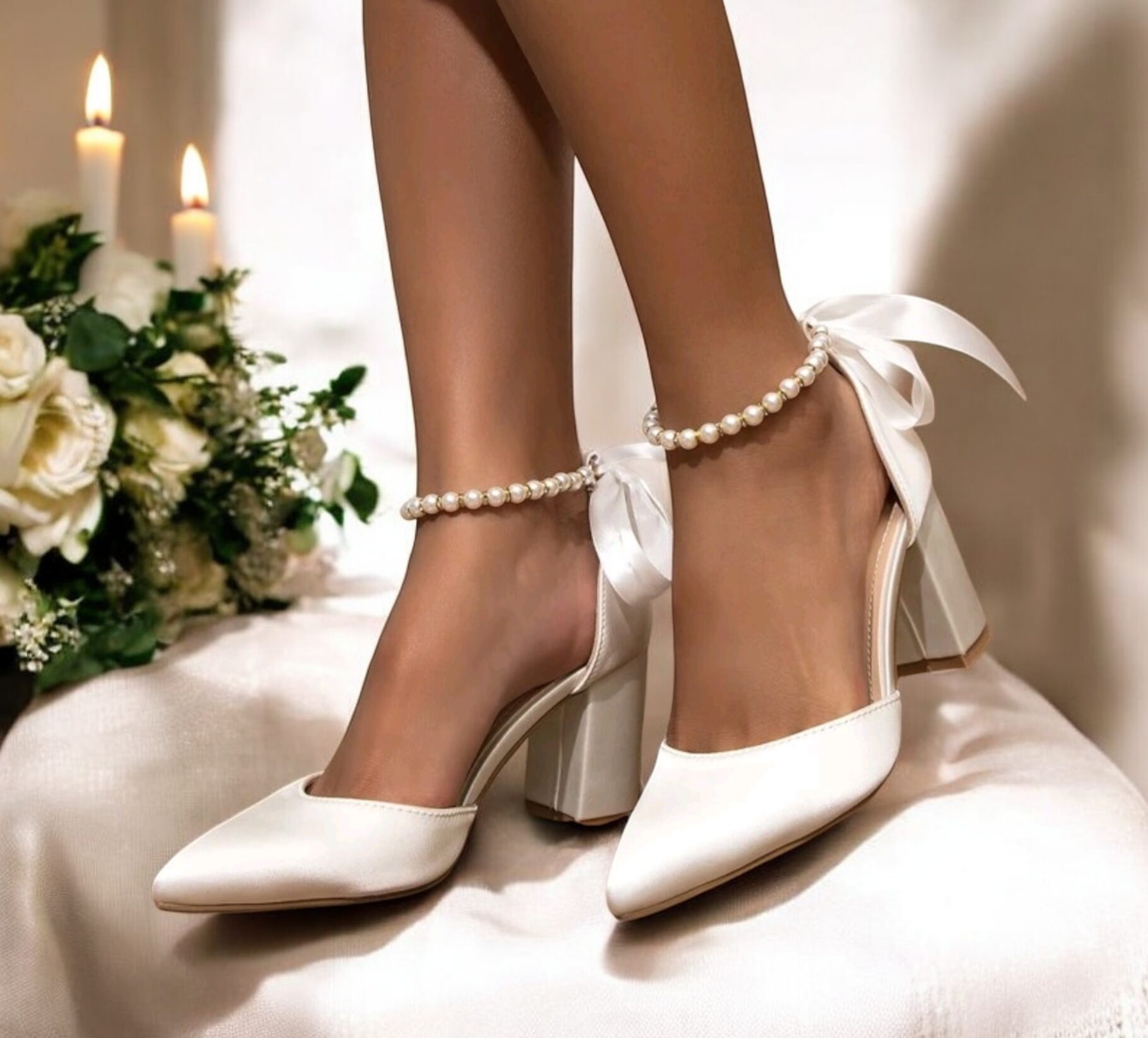 Bridal Pearl decor satin Closed toe Heel – Light Ivory